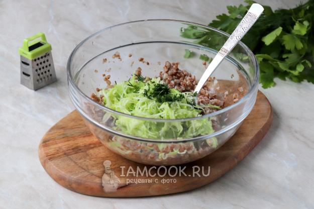 Кабачковую стружку переложите в миску с гречкой. Туда же добавьте мелко нарезанный укроп или любую другую зелень по вашему желанию.