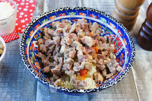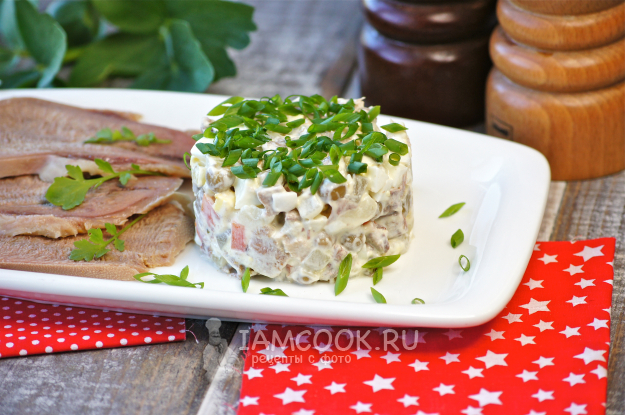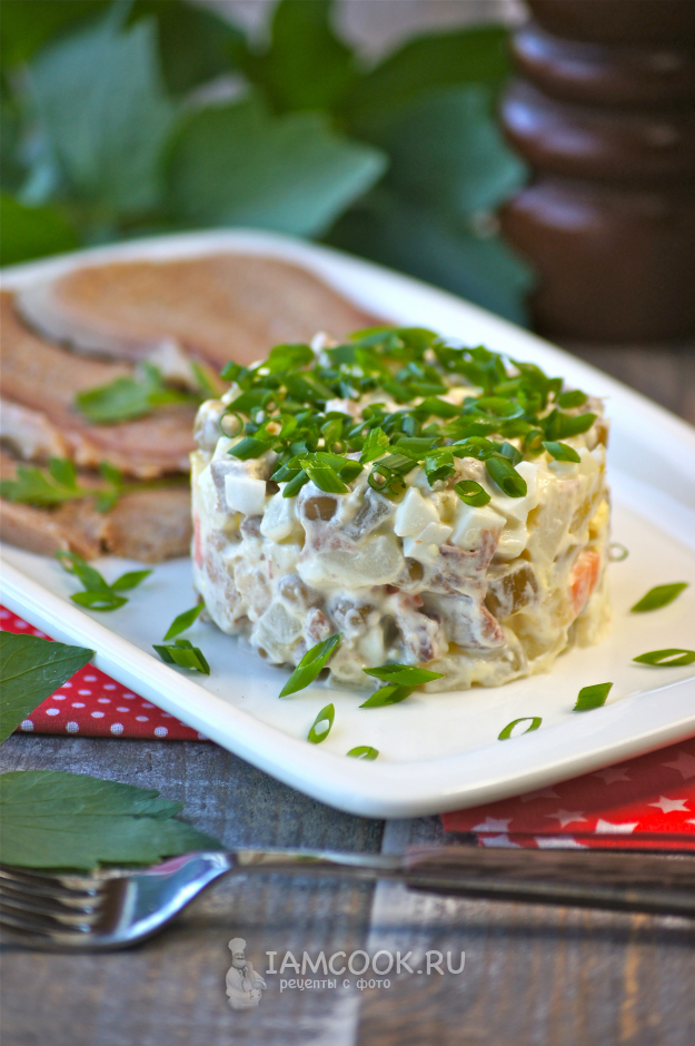 Вкусный, сытный салат «Оливье» с говяжьим языком готов.