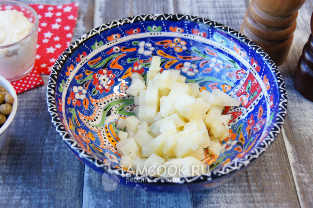 Картофель нарежьте на небольшие кубики и выложите в салатник.