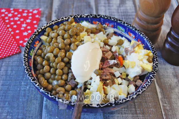 Перед подачей на стол заправьте салат майонезом, перемешайте.