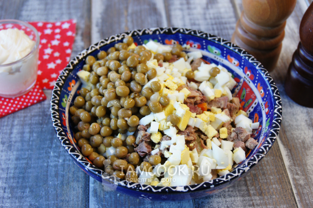 Добавьте консервированный горошек и нарезанные вареные яйца.