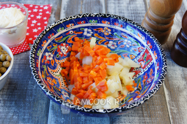 Сварите картофель и морковь в мундире, остудите и очистите. Сварите яйца вкрутую, остудите, очистите.