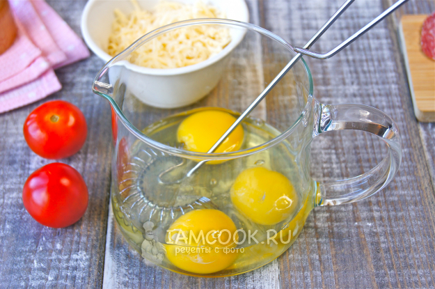 Затем вбейте яйца в чашу, посолите, поперчите и перемешайте венчиком, сильно взбивать не нужно.