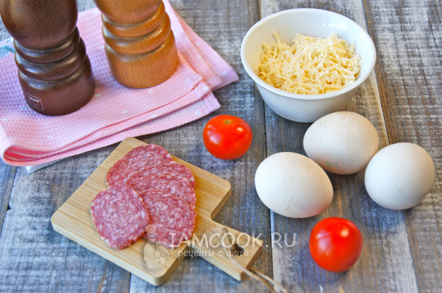Возьмите все необходимые продукты для приготовления слоеной яичницы. Для начала нарежьте на ломтики колбасу и томаты, натрите сыр.