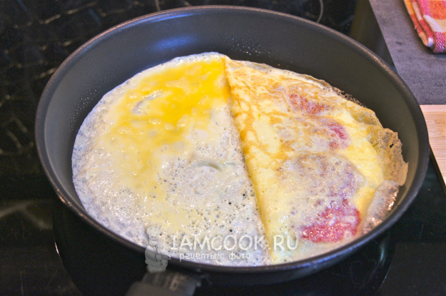 Вылейте еще немного яичной смеси на пустую часть сковороды.