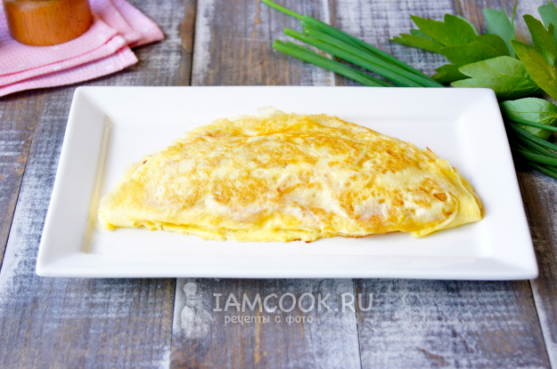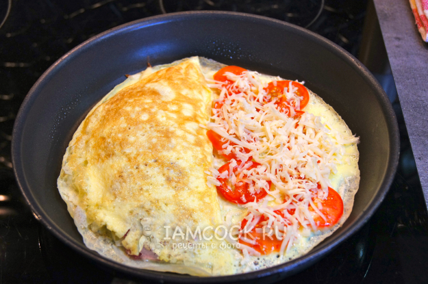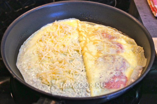 Если осталась яичная смесь, вылейте и посыпьте оставшимся сыром, накройте правой стороной яичницы левую и жарьте около минуты.