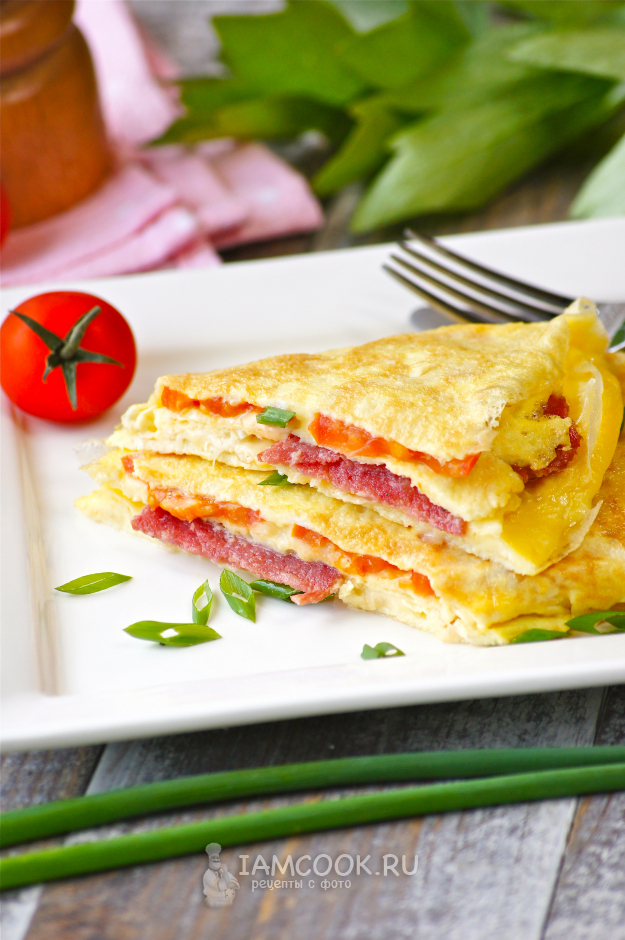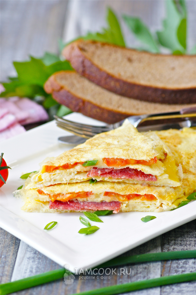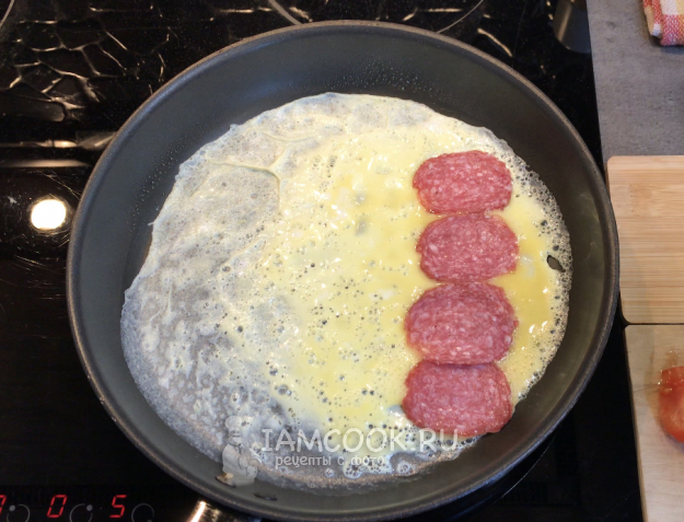 Разогрейте сковороду на умеренном огне, сбрызните маслом, вылейте немного яичной смеси и распределите её по всей сковороде (процесс приготовления похож на выпечку блинов). На правую половинку выложите тонко нарезанную колбасу.