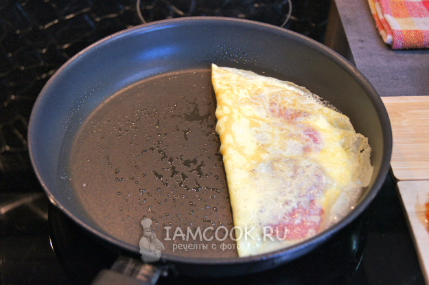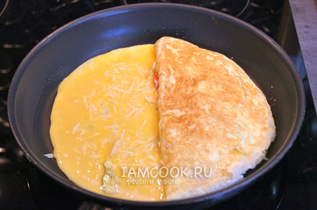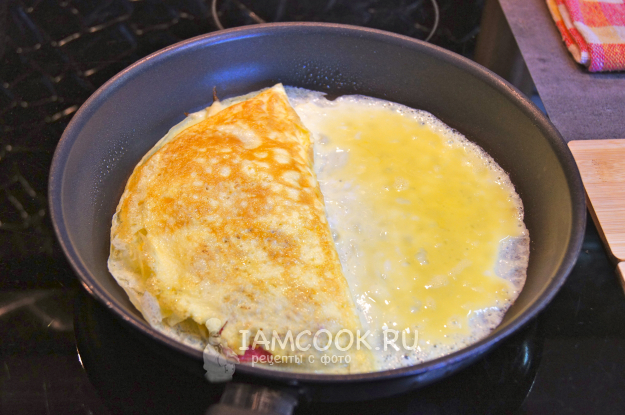 Накройте правой частью левую, влейте еще немного яичной смеси.