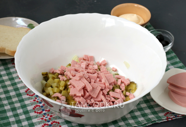 Небольшими кубиками нарезать лук и маринованные огурцы. Из колбасы сразу вырезать уши и отрезать ровный круг для оформления морды. Не забудьте об этом! Только после того, как вырезали нужные детали, оставшуюся колбасу нарезать такими же кубиками, как огурцы. Конечно, если колбасу купили с запасом, то можно детали вырезать в конце.