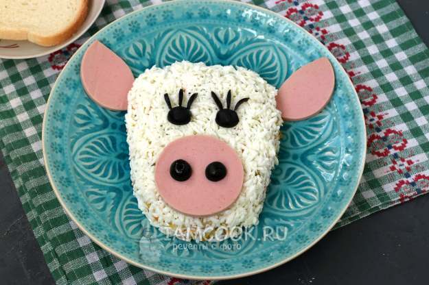 Приложить уши и морду из вырезанных кусочков колбасы. Маслины разрезать пополам и сделать ноздри, глаза и ресницы.