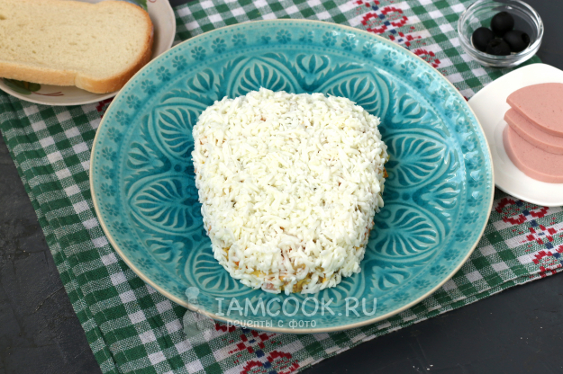 Белки, которые мы отложили, натереть на мелкой тёрке. Покрыть белками голову бычка.
