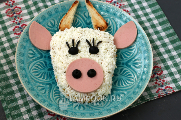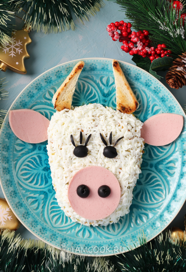 Ну вот и всё. Новогодний салат Оливье в форме бычка готов для праздничной подачи.
