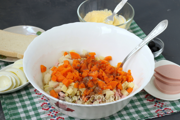 Картофель и морковь очистить и нарезать кубиками, добавить к остальным ингредиентам. Салат посолить и поперчить.