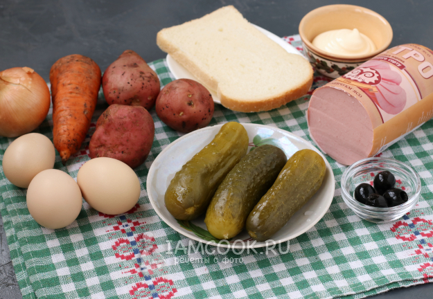 Для приготовления салата Оливье в форме бычка подготовить из списка необходимые ингредиенты. Овощи и яйца сразу поставить варить или сделать это заранее.