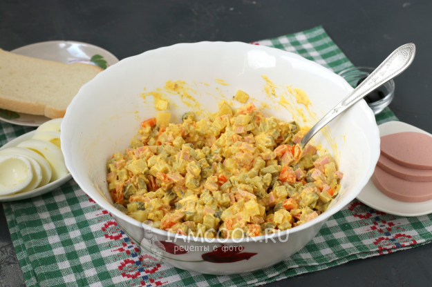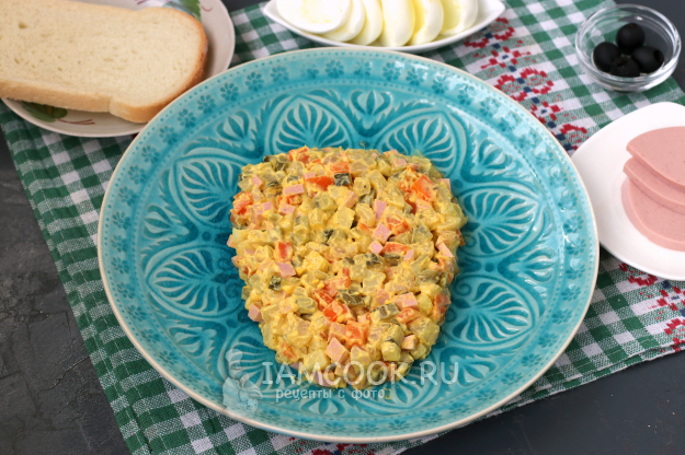 Добавить в оливье заправку и тщательно перемешать. По желанию можно добавить консервированный горошек, но я в этот раз готовила без него. В принципе, салат уже готов.