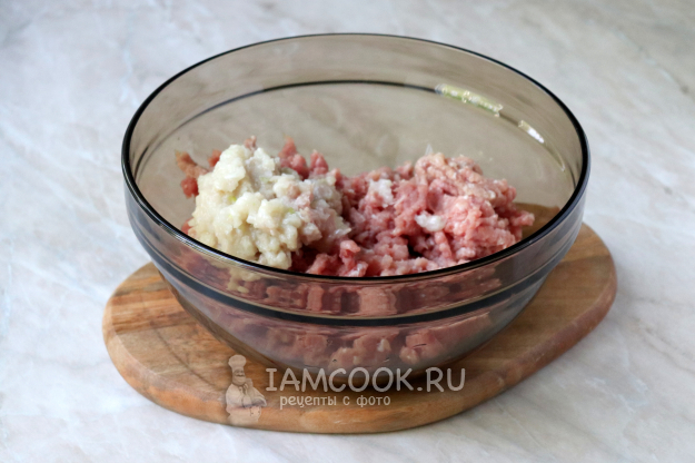 Свиную мякоть нарежьте небольшими кусочками и вместе с луком пропустите через мясорубку.