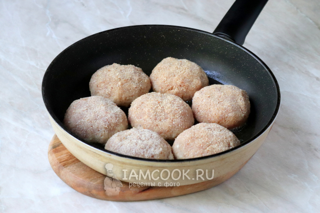 Затем мокрыми ладонями сформируйте круглые заготовки и обваляйте их в сухарях.