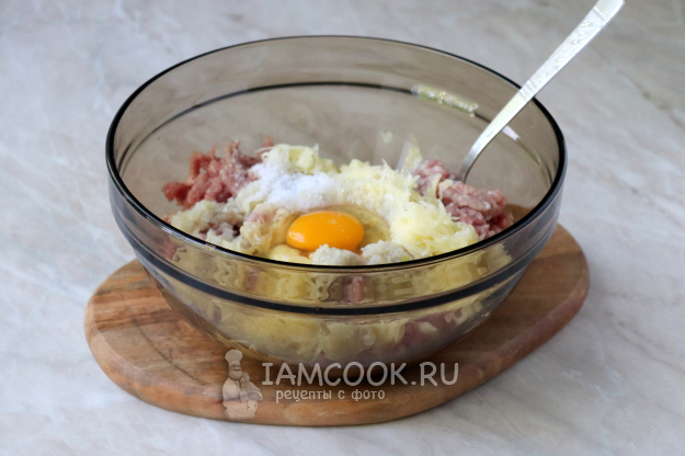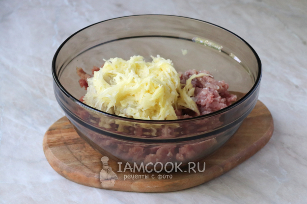 Картофель натрите на тёрке со средними ячейками и добавьте в миску с фаршем.