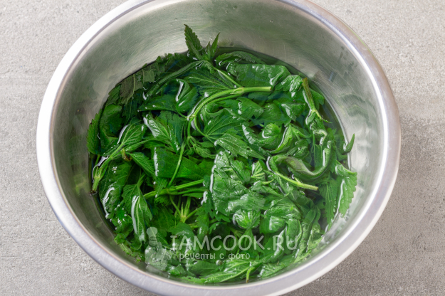 Пока овощи будут вариться, займемся крапивой. Надеваем перчатки (чтобы не обжечь наши нежные ручки), хорошо промываем крапиву под проточной водой. Кипятим небольшое количество воды и заливаем этим кипятком промытую крапиву. Теперь крапива не жжется и ее можно даже без перчаток измельчить ножом.