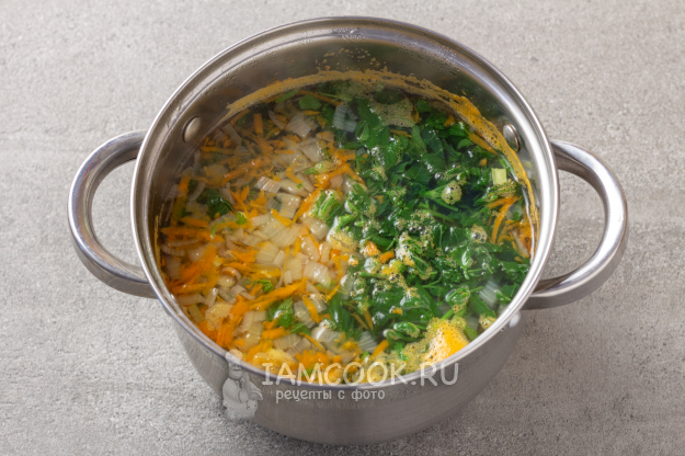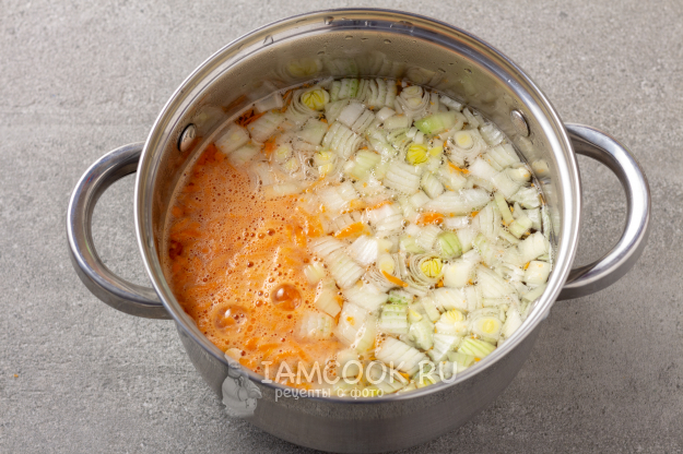 Режем мелко луковицу и трем на терке морковь (у меня была замороженная натертая морковь). Кладем лук и морковку в воду или бульон и ставим кастрюлю на огонь.