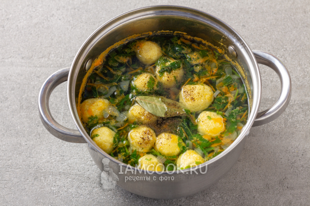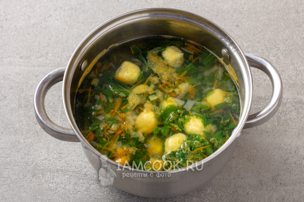 Формируем руками небольшие шарики из теста и кладем их в суп. И продолжаем варить еще минут 10.