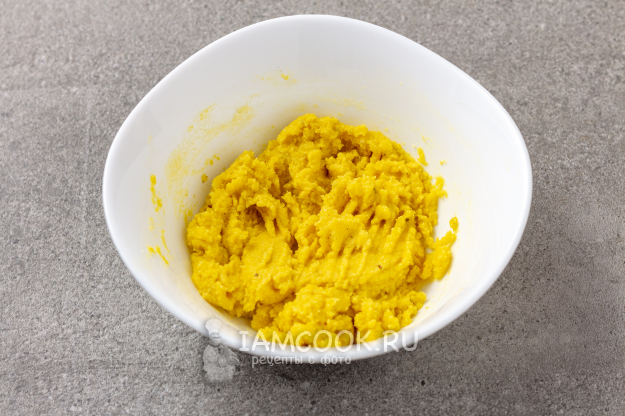 Всыпаем кукурузную муку и хорошо размешиваем, чтобы не было комочков. Слишком густое тесто не делайте, иначе клецки будут очень плотными и твердыми.