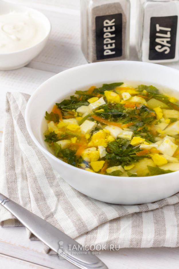 Добавляем нарезанную крапиву в суп и варим еще 5 минут.