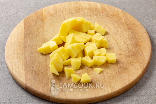 Затем нарезаем картофель кубиками и отправляем в суп. Ждём, пока закипит, и варим после закипания на медленном огне минут 10.