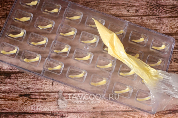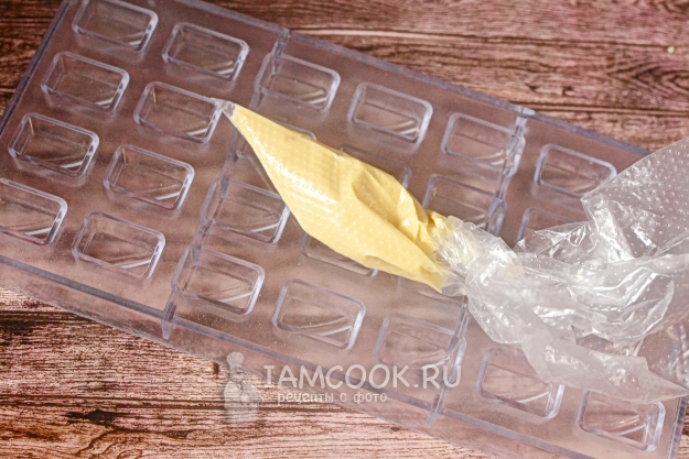 Помещаем расплавленный белый шоколад в кондитерский мешок или кулинарный шприц. Делаем тонкий надрез.