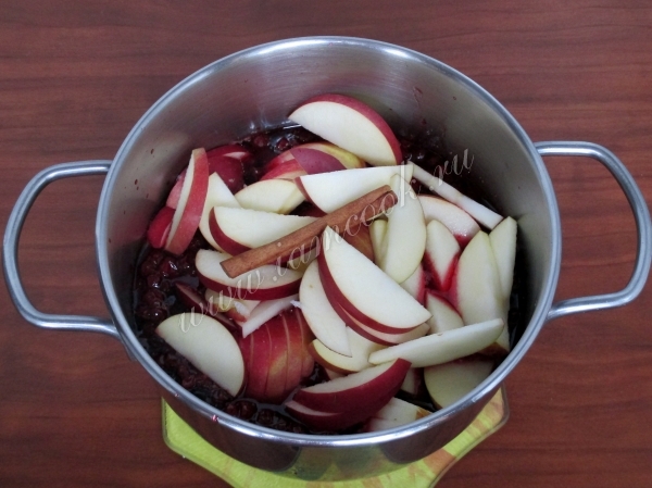 У яблок по желанию удалите или оставьте кожуру и нарежьте дольками, добавьте их и корицу в брусничную массу и варите все вместе 15 минут на среднем огне.