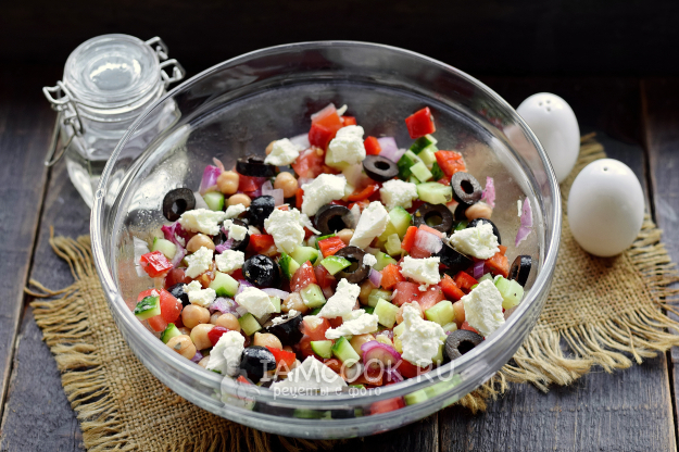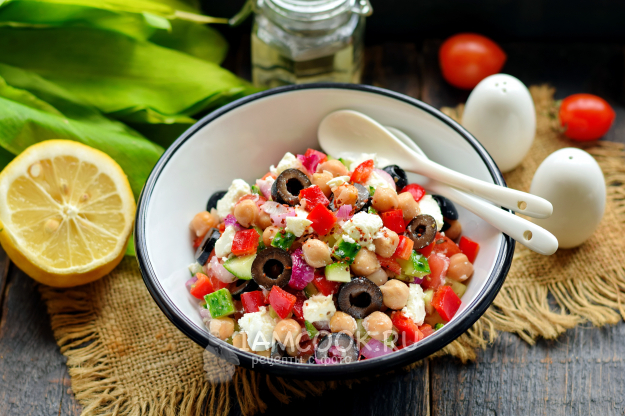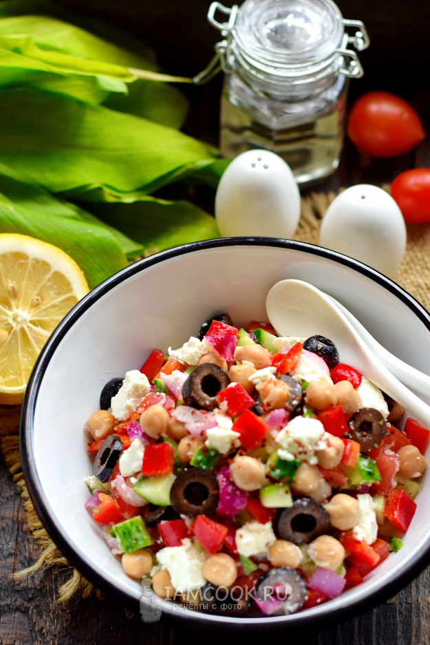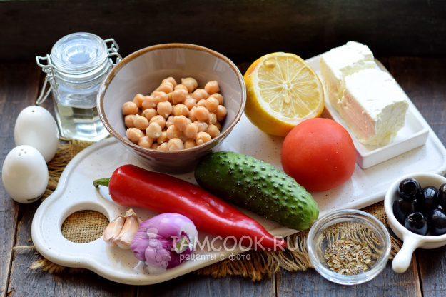 Приготовьте компоненты для греческого салата с нутом. Овощи тщательно вымойте, высушите.