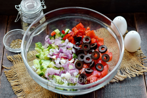 Овощи сгрузите в глубокий салатник. Красный лук нарубите кубиком, маслины нарежьте кольцами. Лук и маслины добавьте в салат.