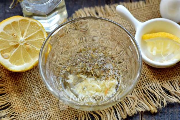 Отдельно приготовьте заправку. В пиалочку влейте масло, добавьте измельченный в кашицу чеснок, соль, перец, орегано, выдавите сок из лимона. Компоненты тщательно перемешайте.