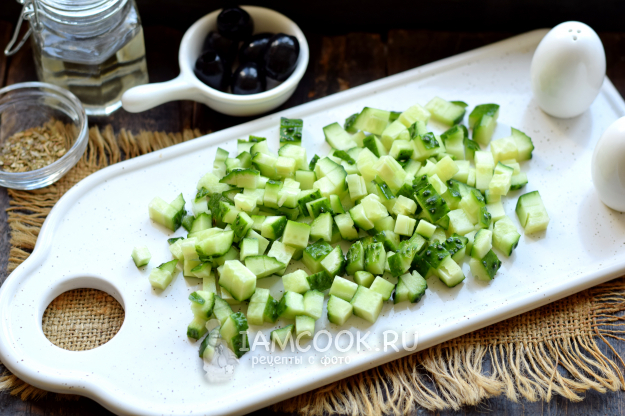 Огурцы нарежьте ровными кубиками среднего или крупного размера.