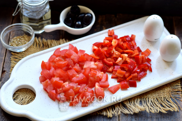 Помидор нарежьте крупными кубиками, сок, который выделится, слейте. Перец очистите от семян, нашинкуйте аналогично другим овощам.