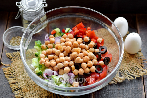 Консервированный нут промойте от маринада, добавьте в основной состав.