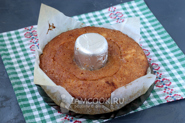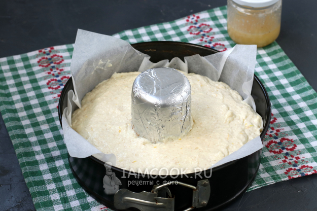 Застелить пергаментом форму и влить тесто. Если форма силиконовая, то застилать и смазывать её не нужно. Я теперь часто делаю кексы и манники с дыркой посередине.