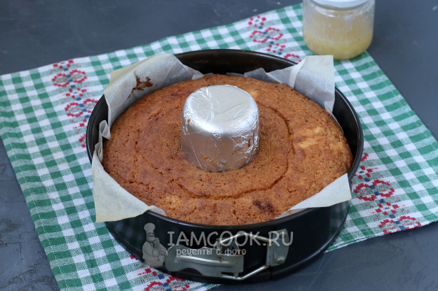 В тёплую кипячёную воду добавить мёд и выжать из лимона сок, хорошо перемешать. Горячий манник проткнуть шпажкой по всей поверхности и понемногу вылить пропитку. В силиконовую форму можно, не боясь, вылить сверху на манник всю пропитку и оставить так до полного впитывания. Поскольку у меня форма металлическая, то я извлекла манник из формы на тарелку и пропитывала частями.