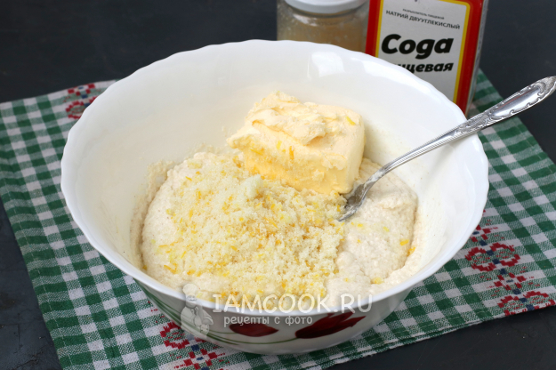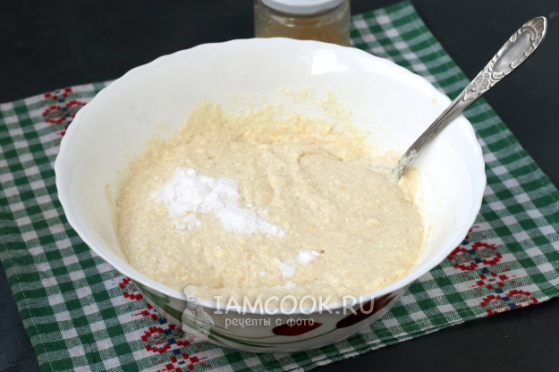 В эту смесь добавить соду и ещё раз хорошо перемешать.