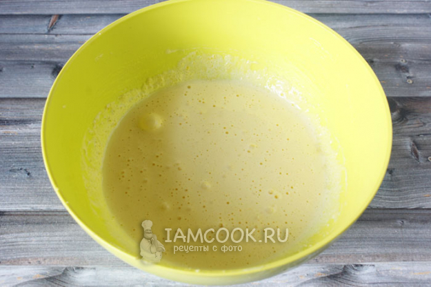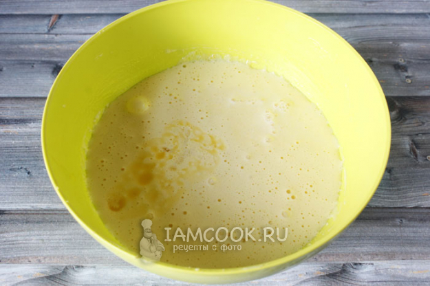 Вливаем растопленное сливочное масло и простоквашу. Немного масла (не растопленного) оставить для смазывания формы.