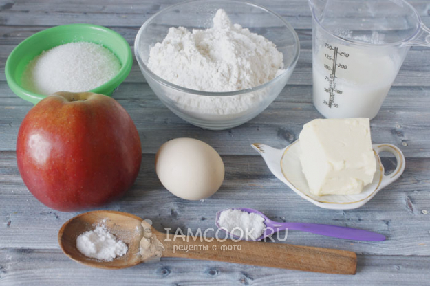 Для приготовления пирога с яблоками на простокваше готовим продукты по списку. Я использовала одно большое яблоко весом примерно 150 г. Если у вас яблоки меньше, то берите два. Вместо ванилина можно взять ванильный сахар по вкусу.