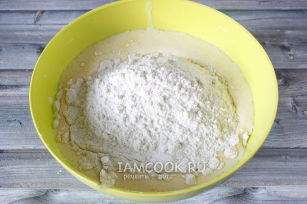 Всыпаем просеянную муку и соду.