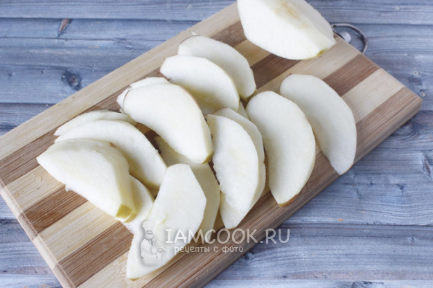 Для начинки яблоко очищаем от кожуры и сердцевины и нарезаем тонкими дольками.