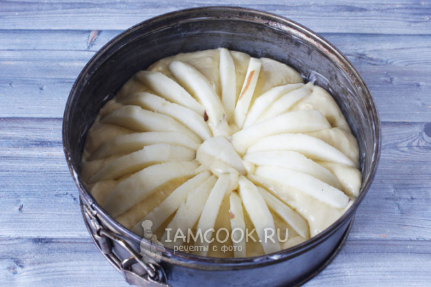 Сверху выкладываем яблочные дольки, втыкая их в тесто, как показано на фото.