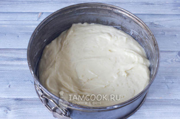 Форму для выпечки смазываем сливочным маслом, выливаем тесто и разравниваем его лопаточкой.