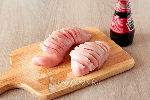 Куриную грудку возьмите чуть подмороженной и нарежьте тонкими ломтиками, не прорезая до самого конца, чтобы получилась гармошка. Посолите снаружи и внутри, оставьте промариноваться на несколько минут. Вместо соли можете воспользоваться соевым соусом в произвольных пропорциях.