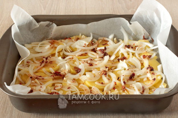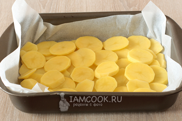 Картофель очистите и нарежьте тонкими колечками. Слегка посолите, и добавив ложку масла, хорошо перемешайте. Выложите картофель внахлест прямо на антипригарный пергамент в форму для запекания. Можно обойтись и без пергамента, просто смажьте форму маслом.