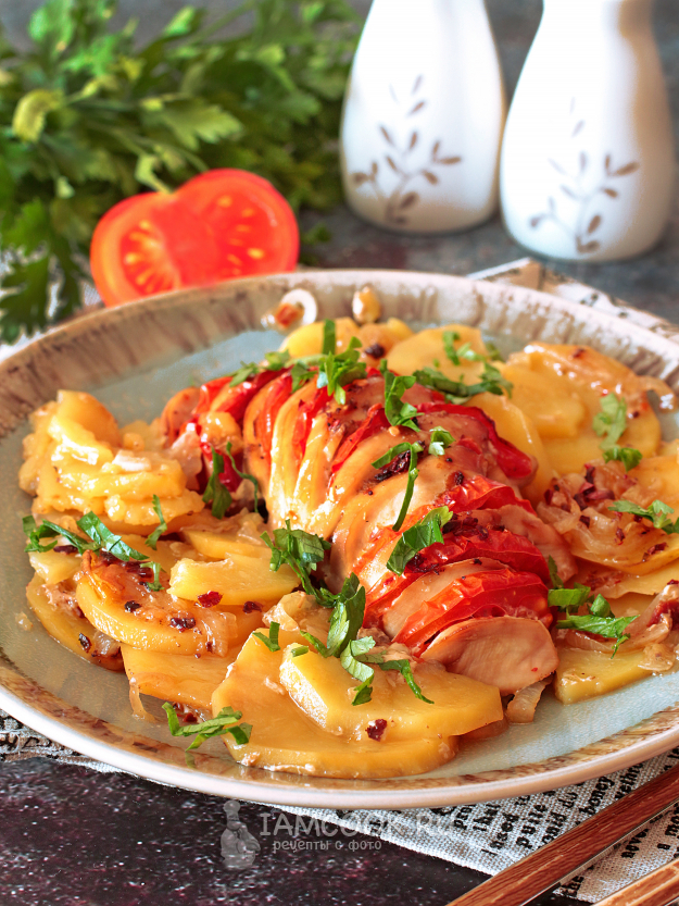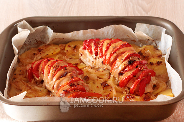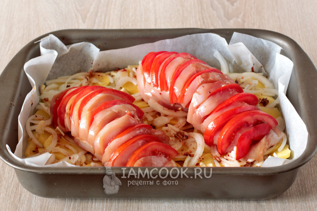 В надрезы куриной грудки вставьте полукольца помидора и уложите мясо поверх картофеля и лука.
