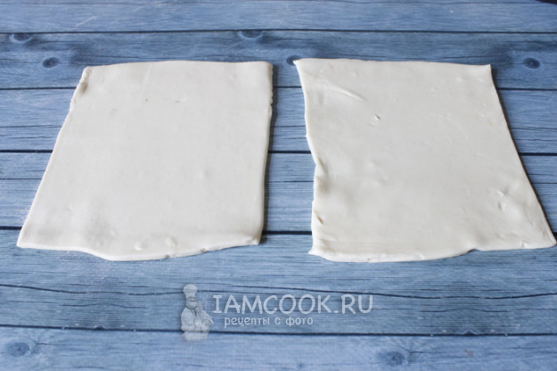 Тесто разрезаем поперек на две части и каждую из них слегка подкатывам скалкой.