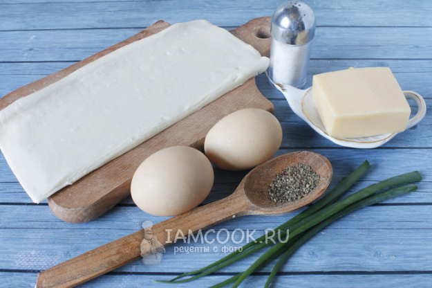 Возьмите продукты для приготовления яичницы в слоеном тесте в духовке. У меня в упаковке было 500 г теста одним пластом - я отрезала пятую часть. Тесто предварительно размораживаем при комнатной температуре. Как только оно станет слегка мягким и податливым, можно готовить. Сильно размораживать его не рекомендуется, иначе с ним будет неудобно работать и придется подсыпать муку. Также учтите, что тесто быстро заветривается, поэтому при разморозке положите его в пакет. Яйца лучше брать небольшого размера, чтобы они не вытекали из формочек.